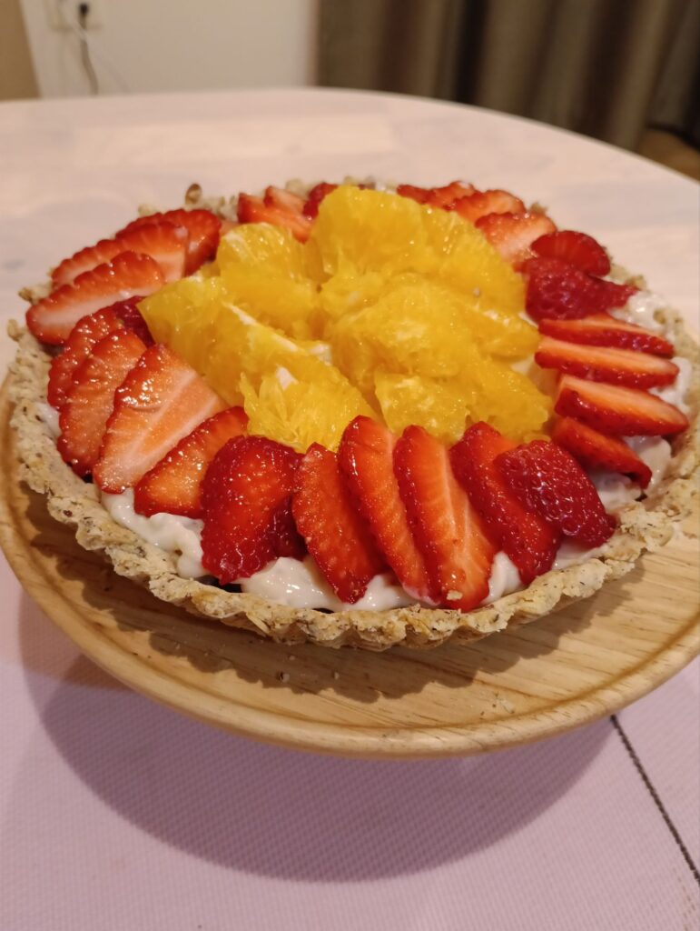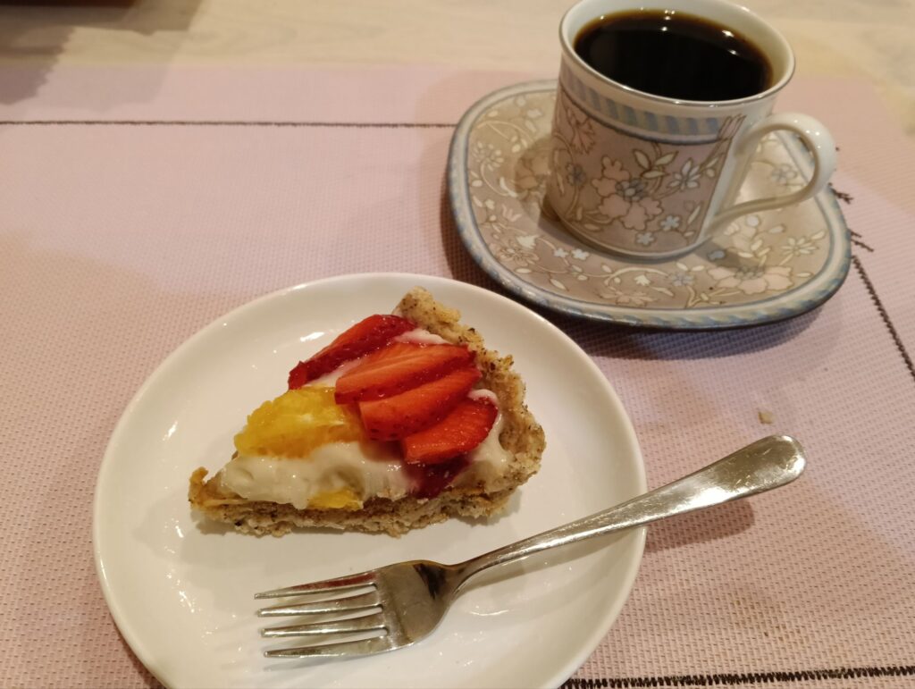 こちらが切り分けたもの。自作オーツミルクをタルト生地の水分兼脂質分として使いましたが適度にサクサクできました。